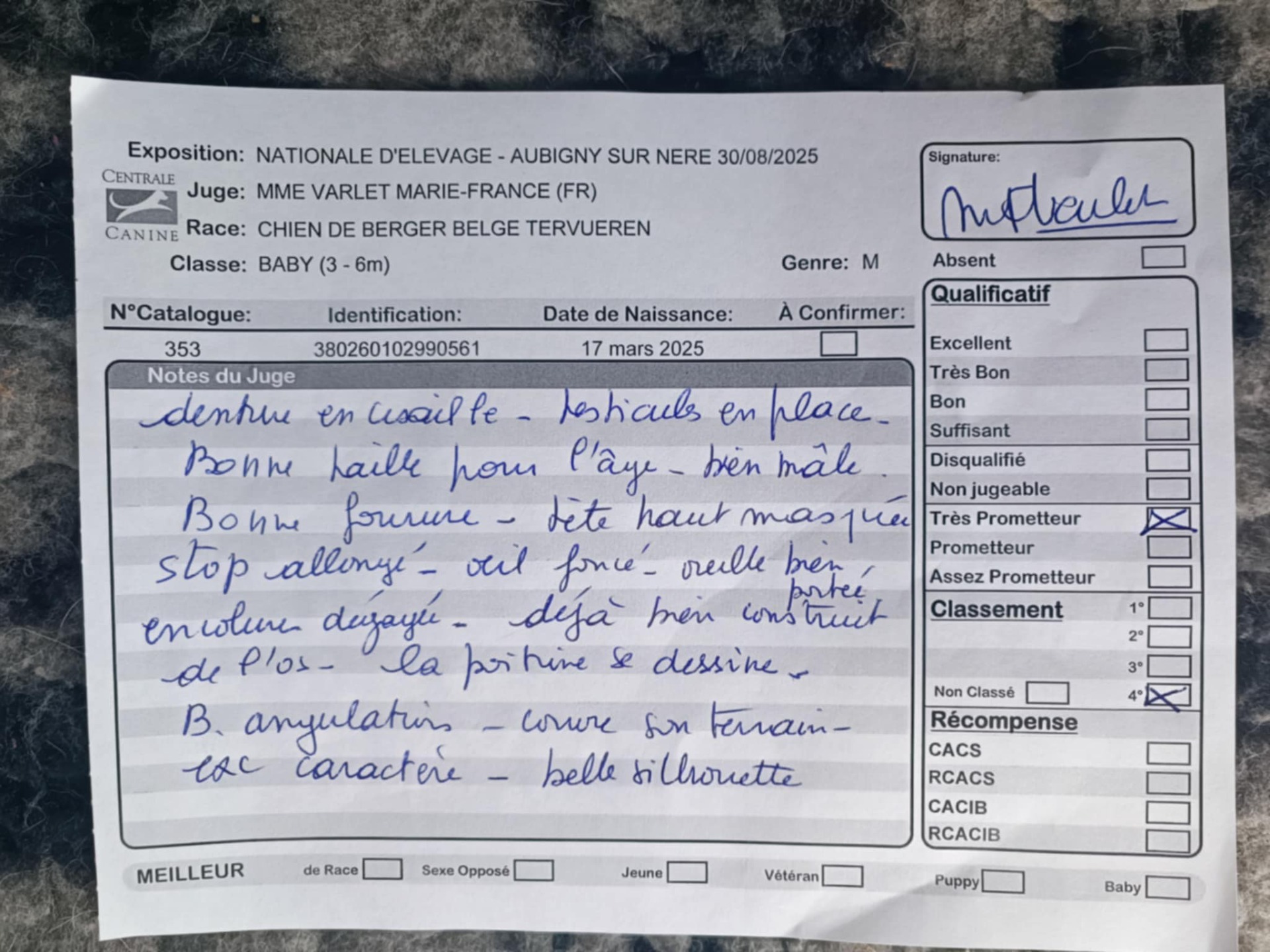 Giudicato da una delle Giudici più importanti per la nostra razza e Presidente del Club del pastore belga Francese, sono molto fiera di questo giudizio,